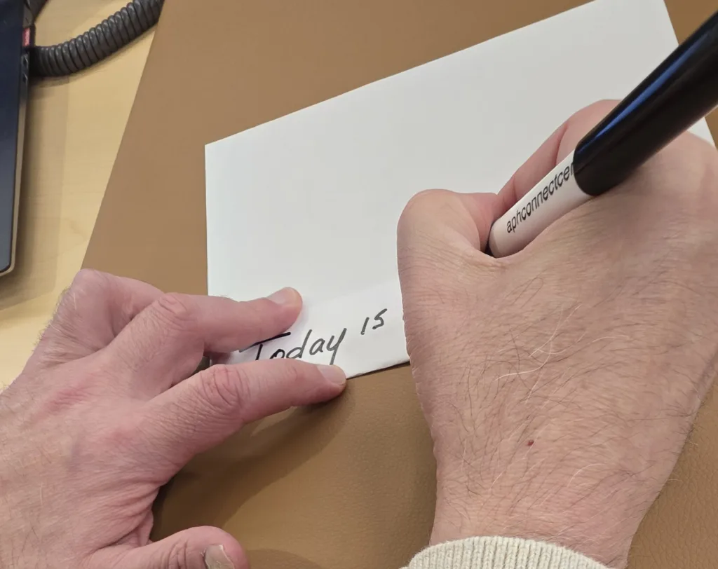 - Place 2-3 layered “Post-it” notes along the writing line to make it easier to locate and feel. Write your name just above the “Post-its” and remove them when finished.